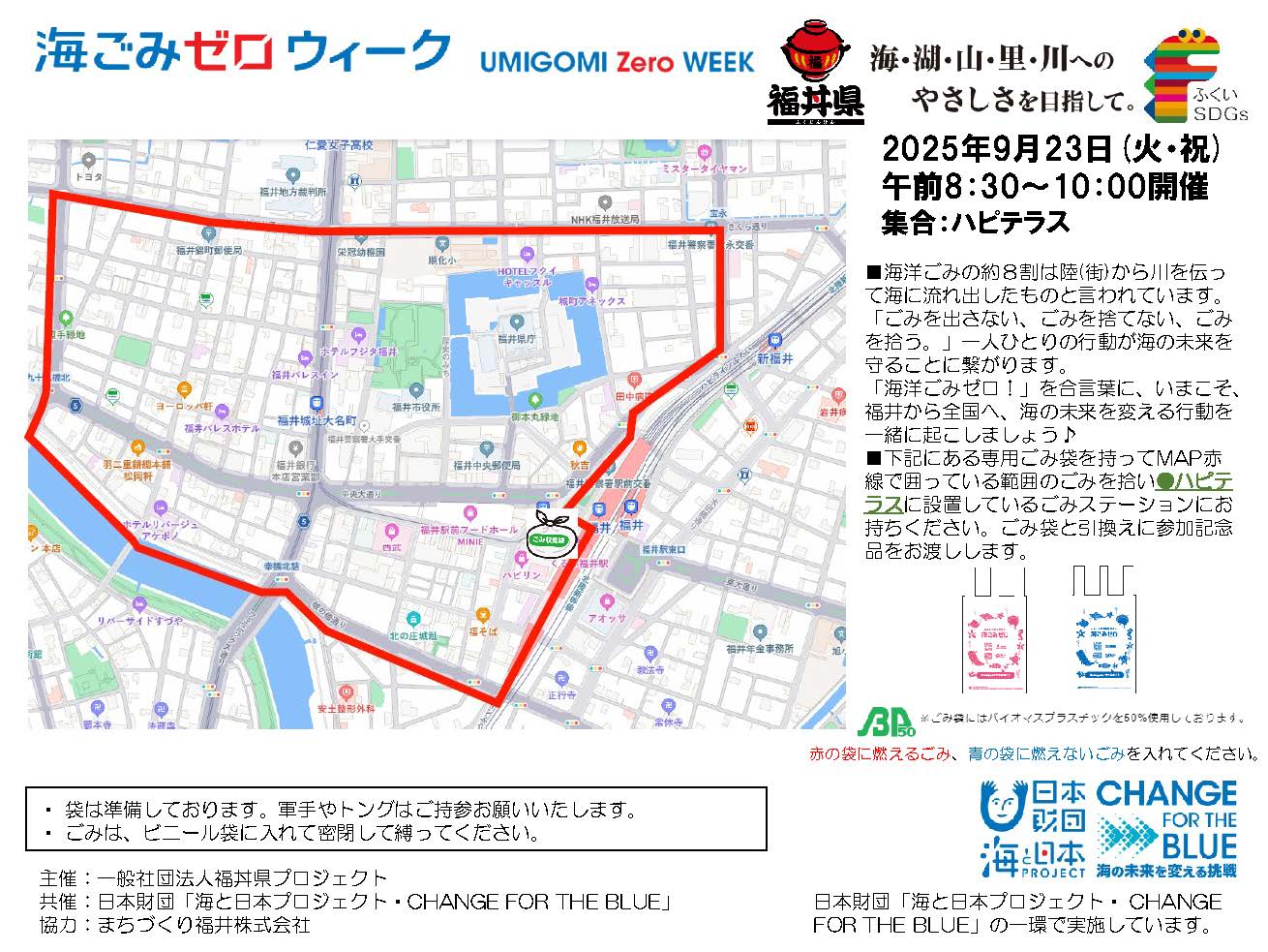 秋の福井まちなか一斉ごみ拾い開催決定! 秋の福井まちなか一斉ごみ拾い 9/23(火・祝)8:30~10:00 ※雨天決行です! 8時30分にハピテラス(福井市中央1丁目2−1)に集合! 福井城址口(西口)~足羽川周辺のごみ拾いを実施します。 申込み不要です!途中参加も大歓迎です! ※ごみ袋は事務局で用意します。軍手やトングは持参をお願いします。 人気記事一覧 福丼カップの出店を決める福丼ウェブ投票ス… 本日8月1日(火)から9月3日(日)の間、県... 2017福丼県Fes.inTGRPで「福… 2017福丼県Fes.inTGRPで「福丼」... 「福丼本(仮称)公式ガイドブック」の参加… 「福丼本(仮称)公式ガイドブック」の参加・掲... 要チェック★福丼県Fes. 放送中CM 10月16日(日)、 スキージャム... 福丼県×愛知県 尾張名古屋の手羽煮丼 福井県産コシヒカリと尾張名古屋の手羽... オススメ記事一覧 2017福丼県Fes.inTGRPで「福… 2017福丼県Fes.inTGRPで「福丼」... 「福丼本(仮称)公式ガイドブック」の参加… 「福丼本(仮称)公式ガイドブック」の参加・掲... 要チェック★福丼県Fes. 放送中CM 10月16日(日)、 スキージャム... 5/29「福丼本(仮称)」掲載店募集! 福井県商工会議所連合会と福丼県プロジェクト実... 賛丼企業による福丼県塗り箸 福丼県公式FBページより。 ...